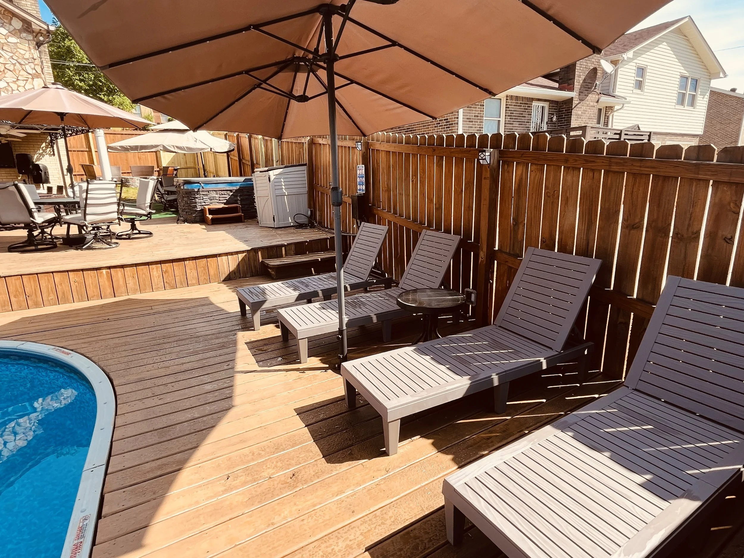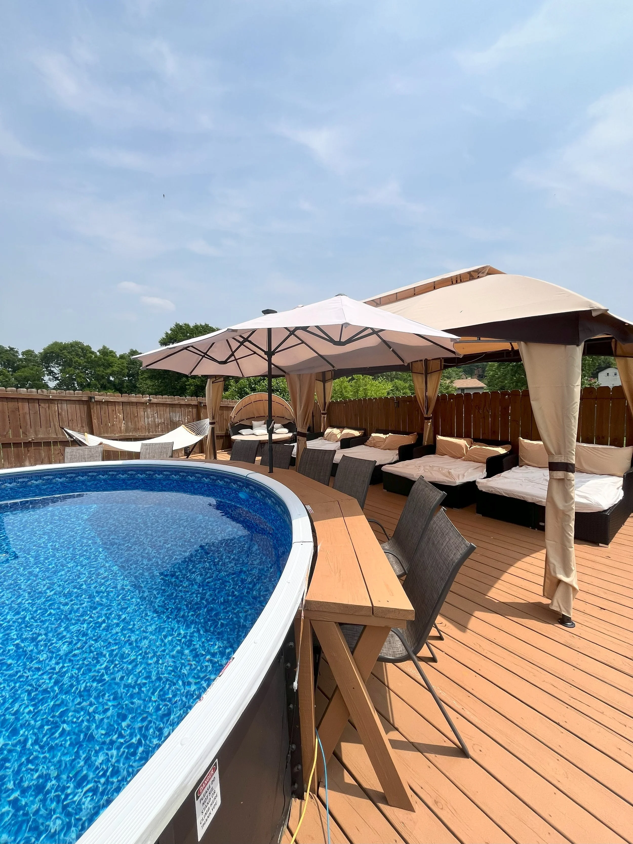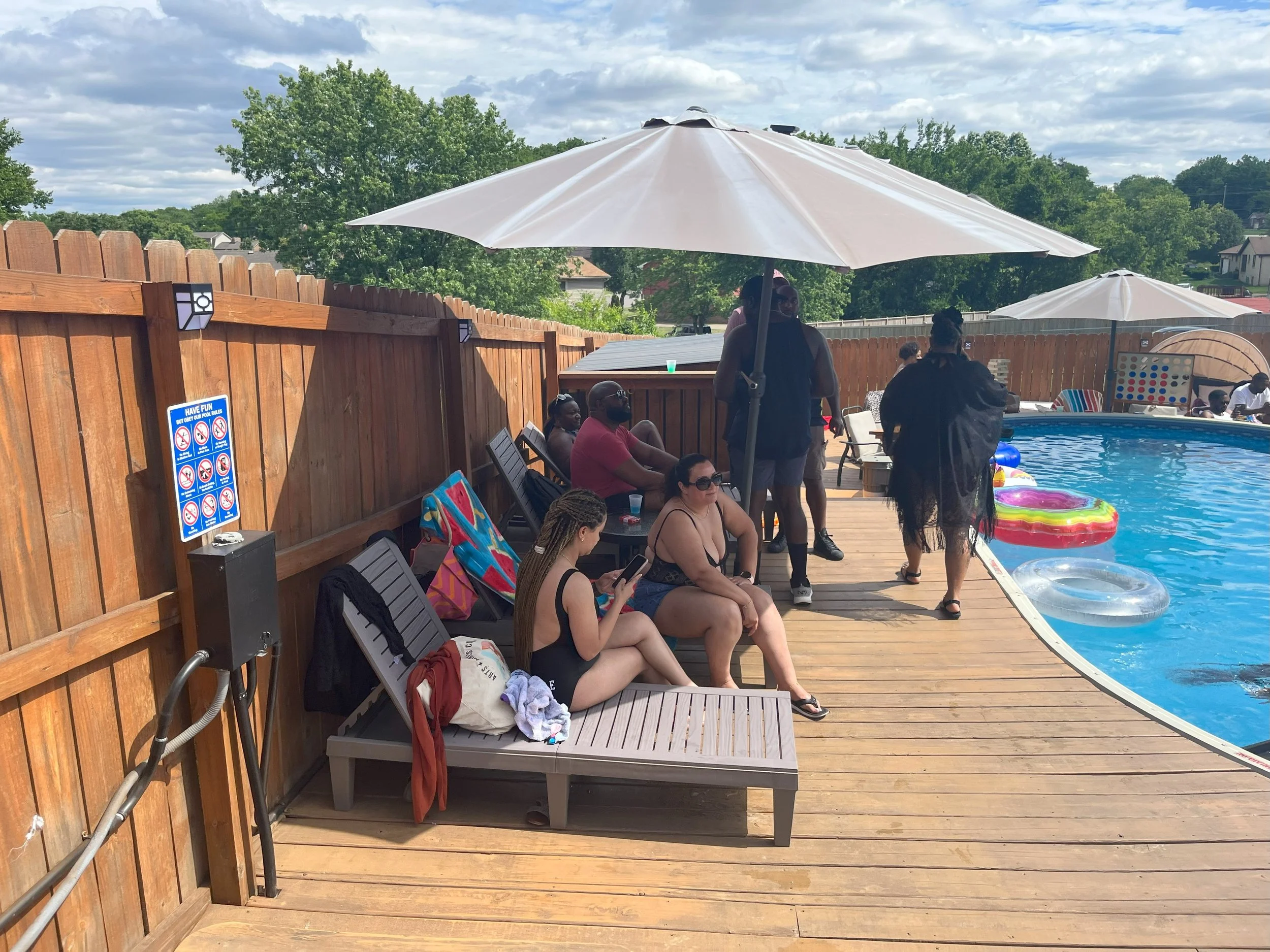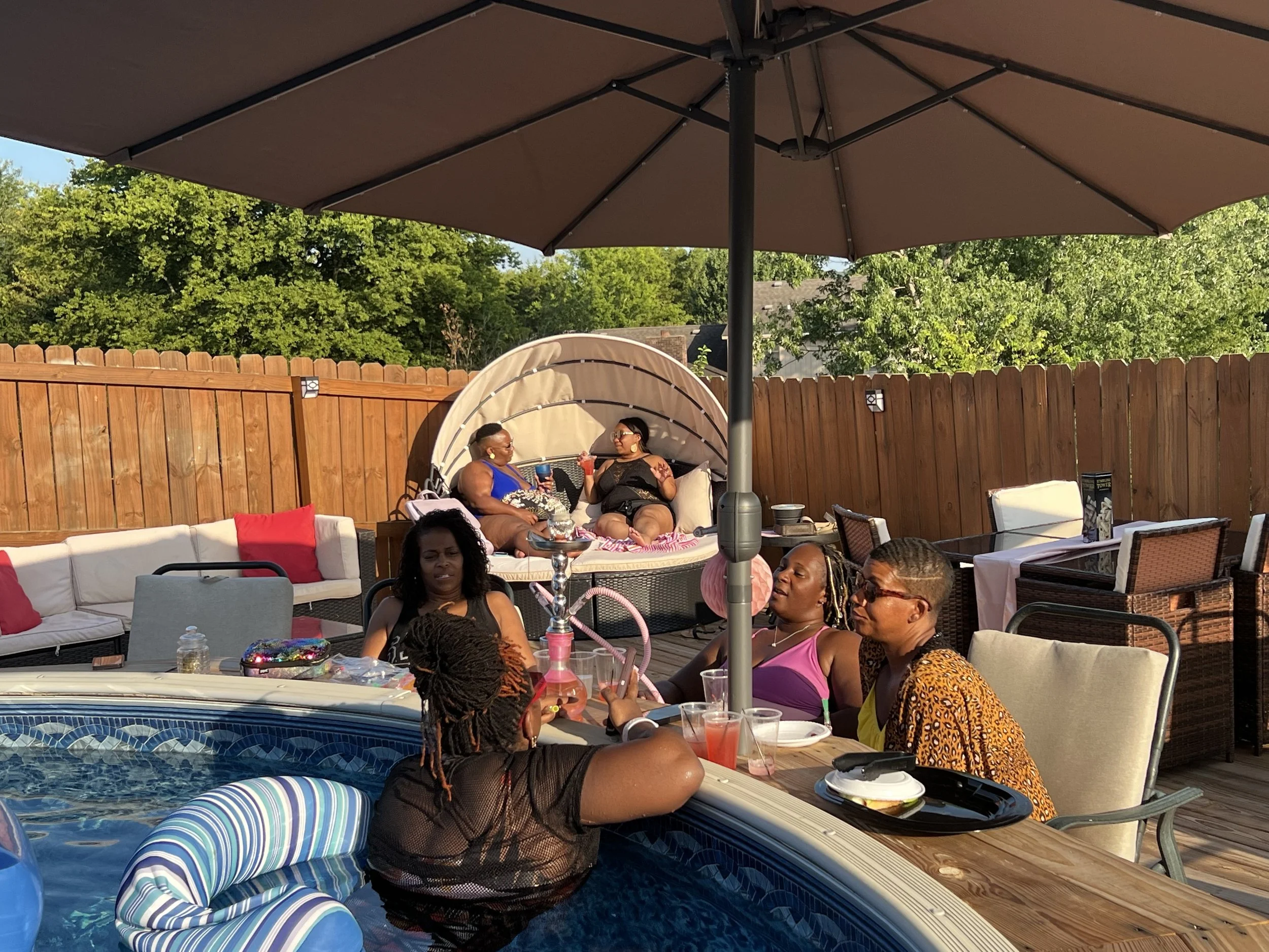 Our space is equipped with all the amenities you need to make your visit comfortable and enjoyable. We have plenty of lounge chairs and umbrellas for shade, as well as a large pool deck for sunbathing and socializing. Our covered patio is perfect for small group gatherings, while our spacious lawn can accommodate larger crowds. We also have a BBQ grill and outdoor kitchen area, making it easy to prepare delicious meals and snacks for your guests.